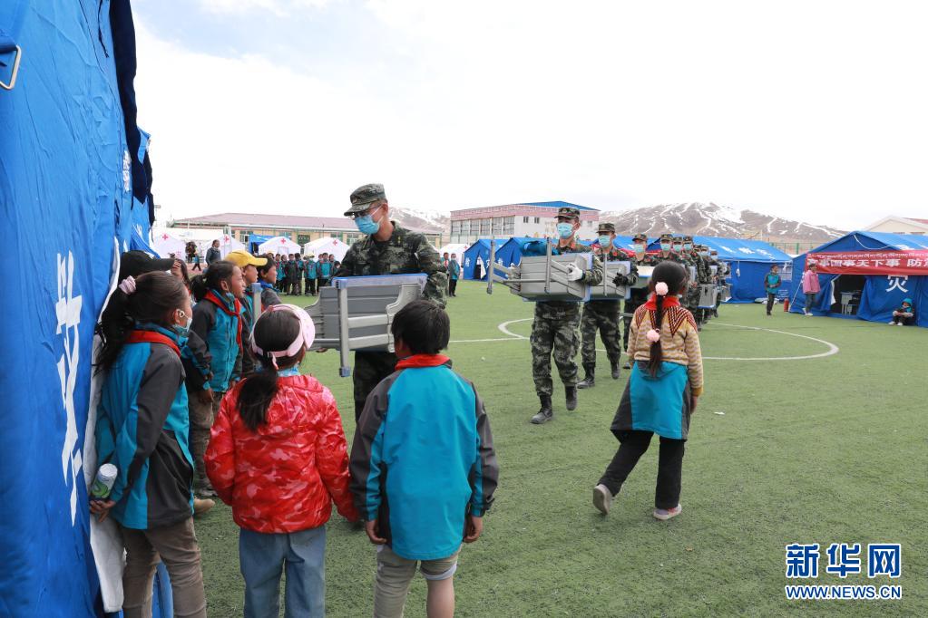 5月24日,武警青??傟牴逯ш牂C動大隊排長張國睿(前一)和戰(zhàn)友為花石峽鎮(zhèn)藏文中心寄宿制小學的帳篷教室搬運課桌。新華社記者 劉芳 攝