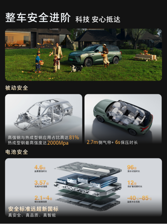 全新蓝山智能进阶版坚信“安全没有刚好,只有不够”,并构筑了一套全维安全守护体系。不但有81%采用了高强钢与热成型钢,关键部位热成型钢强度达到2000兆帕的“硬身板”,还有通过远超国标测试的电池安全保证,其中,模拟碰撞测试的加速度是国标的2倍;盐雾腐蚀测试的时长将近国标的5倍;热扩散观察时长是国标的12倍;浸水时长达国标的96倍。