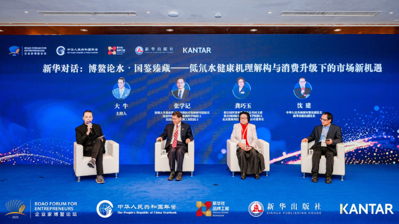 “博鳌发布遇见”成为活动一大焦点。作为中华人民共和国年鉴社推出的品牌赋能平台,“国鉴臻选”与藏域冰泉的合作备受关注,西藏洪海源贸易有限公司总经理王振详细介绍了“国鉴臻选×藏域冰泉”的合作背景与品牌优势。在“新华对话”环节,深圳大学讲席教授、深圳医疗保障研究院院长、国家特聘教授、欧洲科学院院士、美国医学与生物工程院院士张学记,联合国世界和谐基金会共同主席、联合国国际生态安全科学院院士、北京数奥科技发展有限公司董事长龚巧玉,中华人民共和国年鉴社副社长、新华出版社副社长沈建围绕“博鳌论水・国鉴臻藏——低氘水健康机理解构与消费升级下的市场新机遇”,聚焦饮用水细分领域品牌价值升级、资源整合、市场布局等议题展开深入探讨。