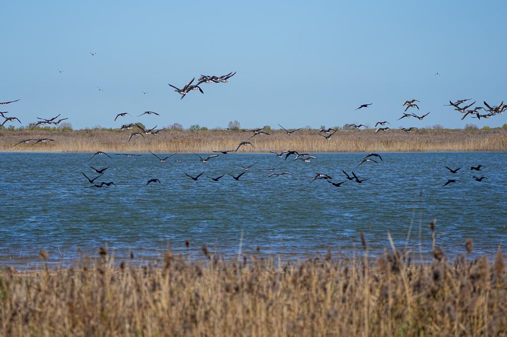A flock of migratory birds fly above the Yellow River Delta National Nature Reserve in Dongying, east China's Shandong Province, Nov. 13, 2025. (Xinhua/Zhu Zheng)