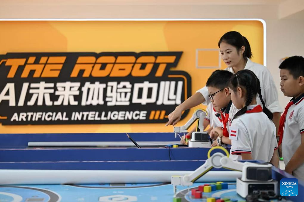Students control a simulated robotic arm at an AI experience center of a primary school in north China's Tianjin, Sept. 4, 2025. (Xinhua/Zhao Zishuo)
