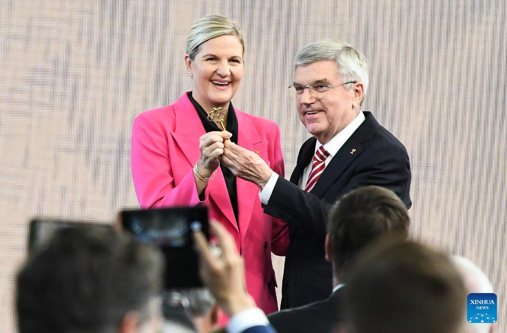 This file photo taken on June 23, 2025 shows IOC President Kirsty Coventry (L) receiving the key from outgoing IOC President Thomas Bach during a president handover ceremony at Olympic House in Lausanne, Switzerland. (Xinhua/Lian Yi)