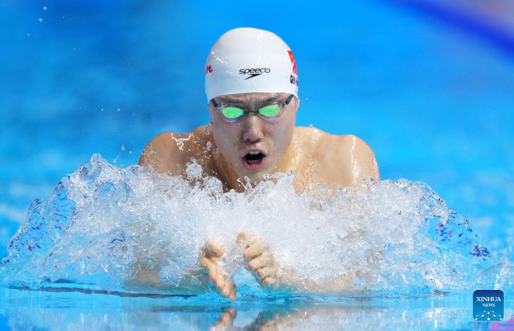 This file photo taken on Aug. 1, 2025 shows Qin Haiyang of China competing during the men's 200m breaststroke final at the World Aquatics Championships in Singapore. (Xinhua/Wu Zhizun)