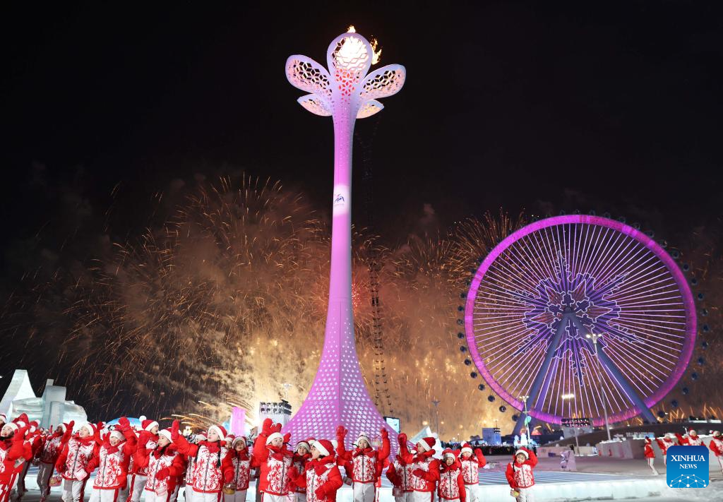 This file photo taken on Feb. 7, 2025 shows the cauldron is lit during the opening ceremony of the 9th Asian Winter Games in Harbin, northeast China's Heilongjiang Province. (Xinhua/Zhang Tao)
