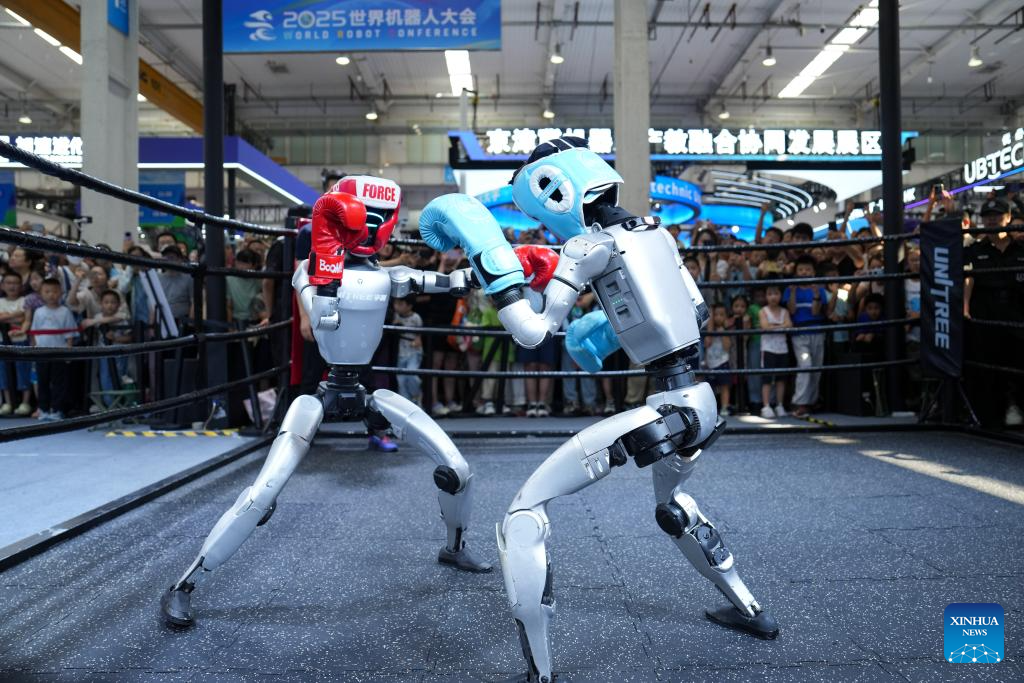 This file photo taken on Aug. 11, 2025 shows humanoid robots combating during a kickboxing match at the 2025 World Humanoid Robot Games in Beijing, capital of China. (Xinhua/Ju Huanzong)