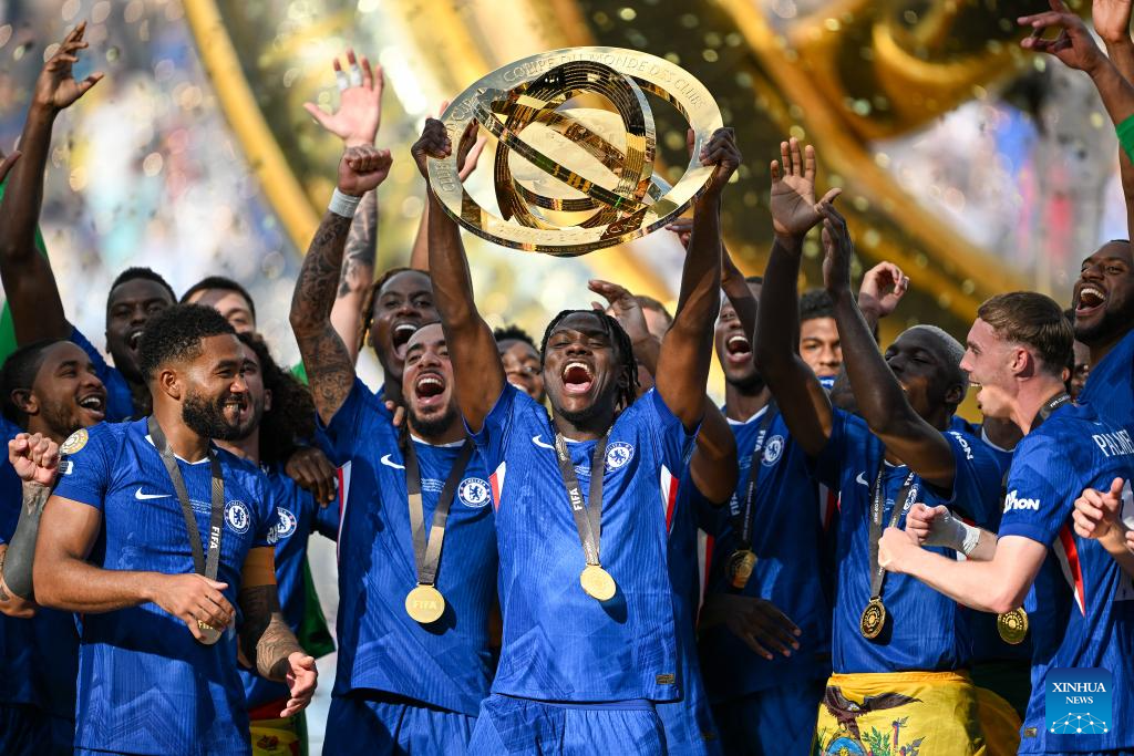 This file photo taken on July 13, 2025 shows players of Chelsea FC celebrating with trophy during the awarding ceremony for the final match between Chelsea FC (England) and Paris Saint-Germain (France) at the FIFA Club World Cup 2025 at the MetLife Stadium, New Jersey, the United States. (Xinhua/Wu Xiaoling)