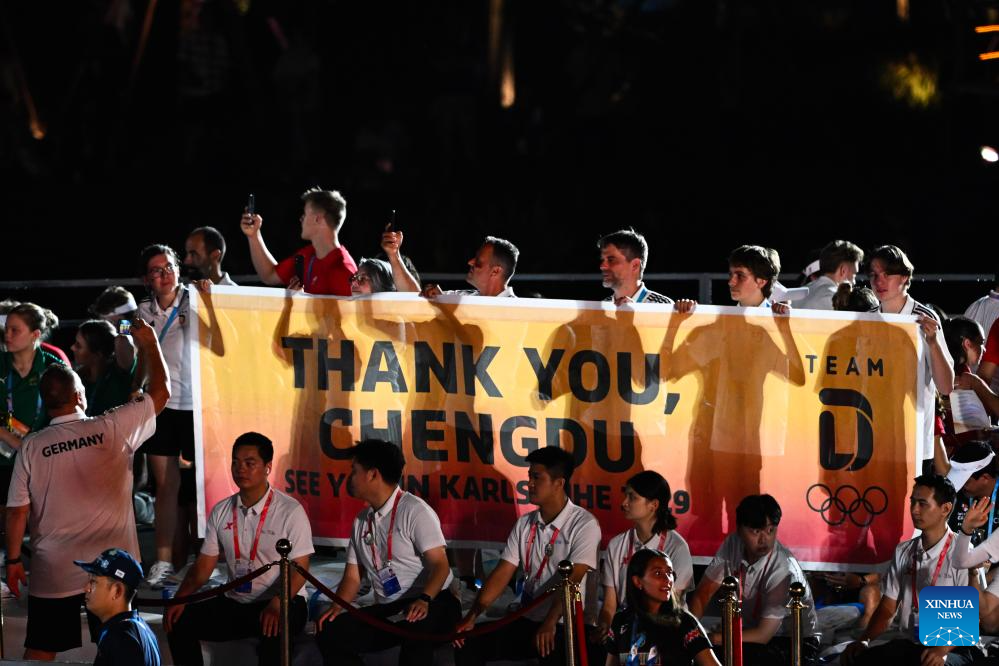 This file photo taken on Aug. 17, 2025 shows members of the delegation of Germany expressing gratitude to the host city Chengdu during the closing ceremony of The World Games 2025 in Chengdu, southwest China's Sichuan Province. (Xinhua/Feng Kaihua)