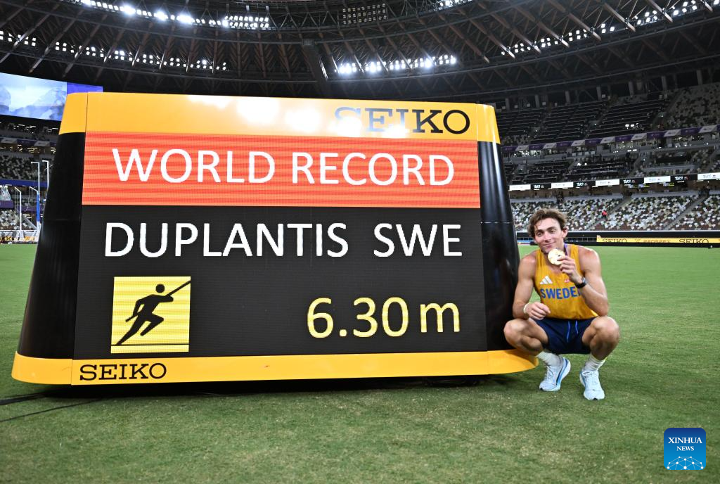 This file photo taken on Sept. 15, 2025 shows Armand Duplantis of Sweden posing with the screen showing his new world record after the men's pole vault final at the 2025 World Athletics Championships in Tokyo, Japan. (Xinhua/Song Yanhua)