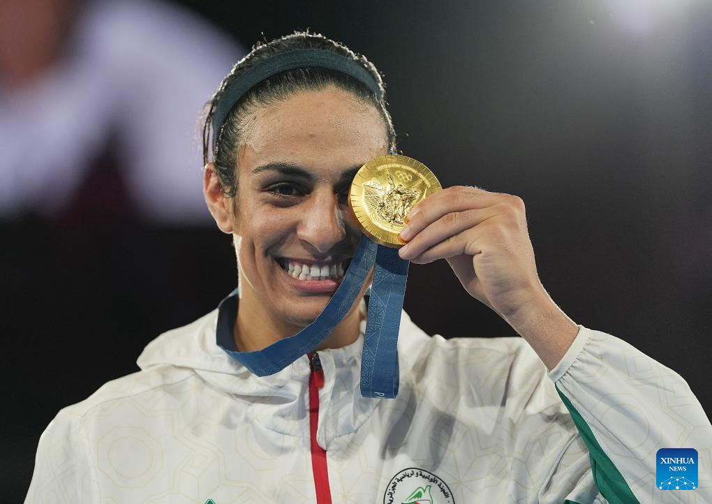 This file photo taken on Aug. 9, 2024 shows gold medalist Imane Khelif of Algeria attending the victory ceremony for the women's boxing 66kg at the Paris 2024 Olympic Games in Paris, France. (Xinhua/Jiang Wenyao)