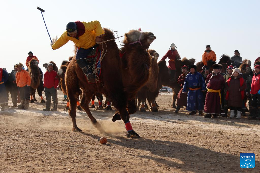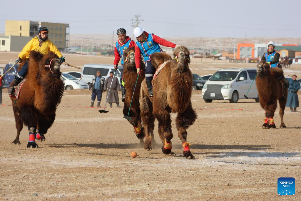 Participant compete in camel polo during a camel festival, in Mandalgovi, Dundgovi province, Mongolia, Jan. 25, 2026. (Photo by Bolortsetseg/Xinhua)
