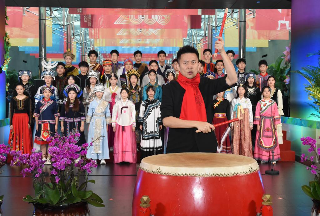 12月22日,演员在国家大剧院北门入口处敲响迎宾鼓,拉开活动序幕。新华社记者 罗晓光 摄