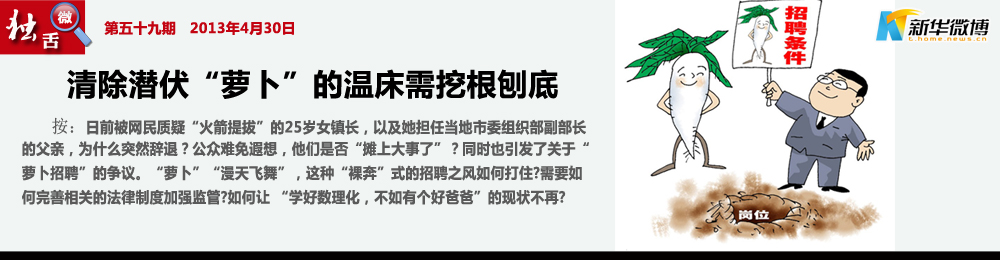 拔“蘿卜”更需祛“污泥” 對曝光的類似事件不能僅僅停留在“補改撤銷”的層面,更多的是對?!疤貦唷?、打“親情牌”、用公權辦私事者的嚴格問責,杜絕補改、撤銷招聘淪為一些人的免責“擋箭牌”,發(fā)現(xiàn)一起、查處一起。