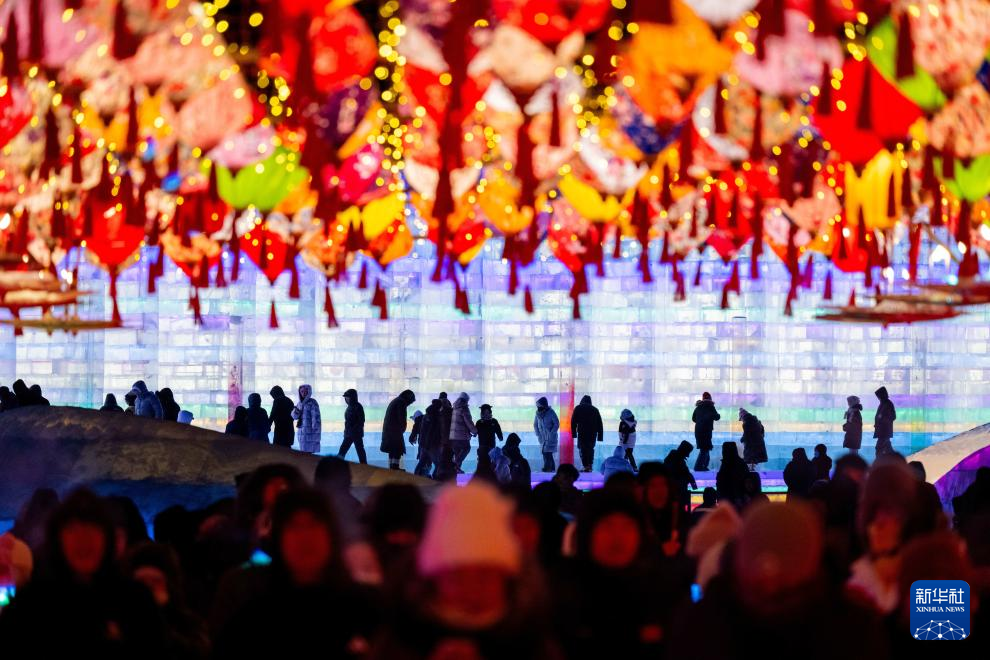 12月17日,游客在哈尔滨冰雪大世界园区内游玩。2025年12月17日上午10时,第二十七届哈尔滨冰雪大世界正式开园迎客。