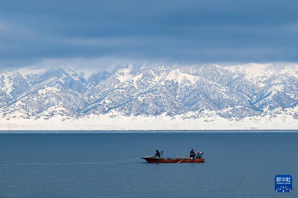 一条小船在赛里木湖中驶过(12月16日摄)。赛里木湖位于新疆博尔塔拉蒙古自治州,是新疆海拔最高、面积最大的高山湖泊。
