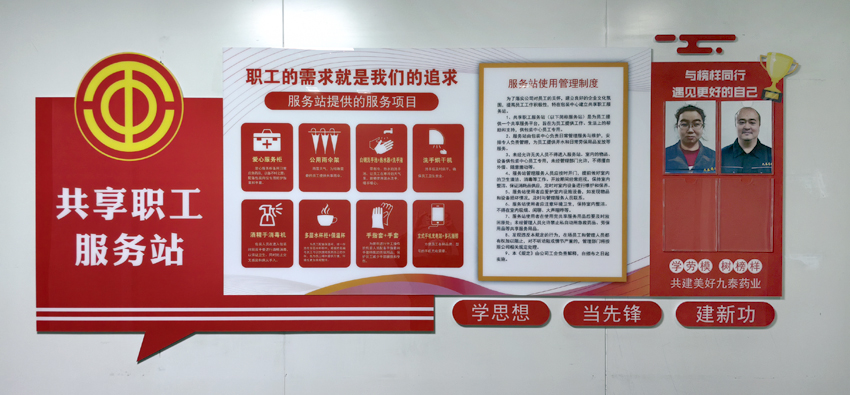 11月25日,公司第一個(gè)共享職工服務(wù)站在包裝中心成立并投入使用。共享職工服務(wù)站文化墻上醒目地提示著共享服務(wù)項(xiàng)目、使用管理辦法,為了豐富文化墻內(nèi)容,還增添了“與榜樣同行遇見更好的自己”優(yōu)秀員工光榮榜。共享職工服務(wù)站內(nèi)共享物品齊全,擺放整齊,共享設(shè)施設(shè)備即符合藥企規(guī)范,也充滿溫馨,充滿愛意。服務(wù)站提供的服務(wù)項(xiàng)目包括:1、愛心服務(wù)柜。愛心服務(wù)柜備用日常應(yīng)急藥品,以備不時(shí)之需;包裝中心員工每天高效、重復(fù)的包裝動(dòng)作很容易被包材劃傷手部,愛心服務(wù)柜為包裝崗位員工配備了處理傷口的藥品和防護(hù)用品。2、公用雨傘。雨雪天氣,為特殊需要的員工提供共享雨傘。3、白鋼洗手池+熱水器+洗手液。洗手池帶有冷、熱水調(diào)節(jié)開關(guān),讓員工在寒冷的天氣里,能夠使用溫水洗手,暖手暖心。4、洗手烘干機(jī)。員工進(jìn)入操作間洗手后及時(shí)烘干,確保員工衛(wèi)生安全。5、酒精手消毒機(jī)。包裝人員在進(jìn)入包裝間前雙手要進(jìn)行酒精消毒,以保證衛(wèi)生,同時(shí)防止交叉感染和病從手入。6、多層水杯柜+保溫杯。為每一名員工配備了大容量保溫杯,統(tǒng)一存放在多層水杯柜中,根據(jù)姓名、編號,員工可以快捷地找到自己的水杯,為員工喝熱水提供方便,環(huán)境也更加美觀整潔。7、手指套+手套。服務(wù)站為常年進(jìn)行手工操作的包裝人員配備了手指套和手套特殊的勞保用品,保護(hù)員工減少手部磨損和受傷。8、立式手機(jī)充電站+多孔插排。方便員工各種品牌、型號的手機(jī)充電需要。