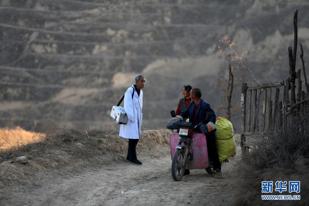 在山西省石樓縣鐵頭村張家灣自然村,張尚保(左)和村民聊天(3月23日攝)。新華社發(fā)(劉亮亮 攝)