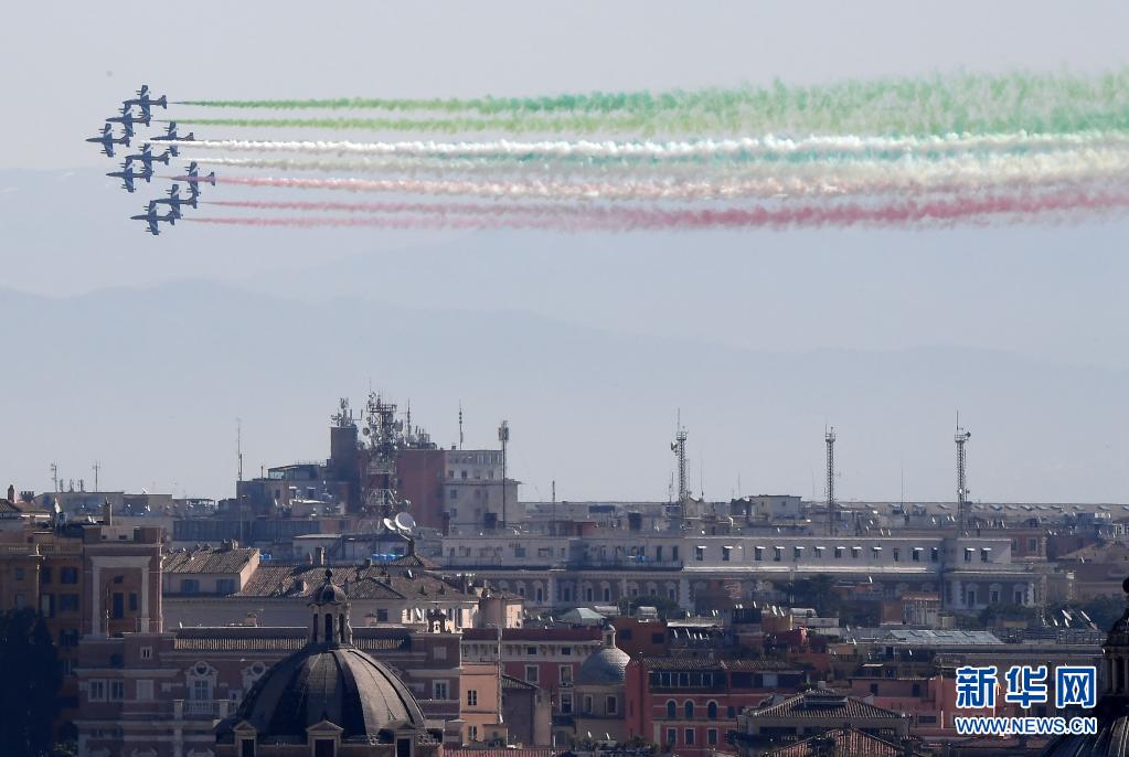 當(dāng)日,意大利“三色箭”飛行表演隊在意大利首都羅馬舉行飛行表演,慶祝意大利空軍建立98周年。