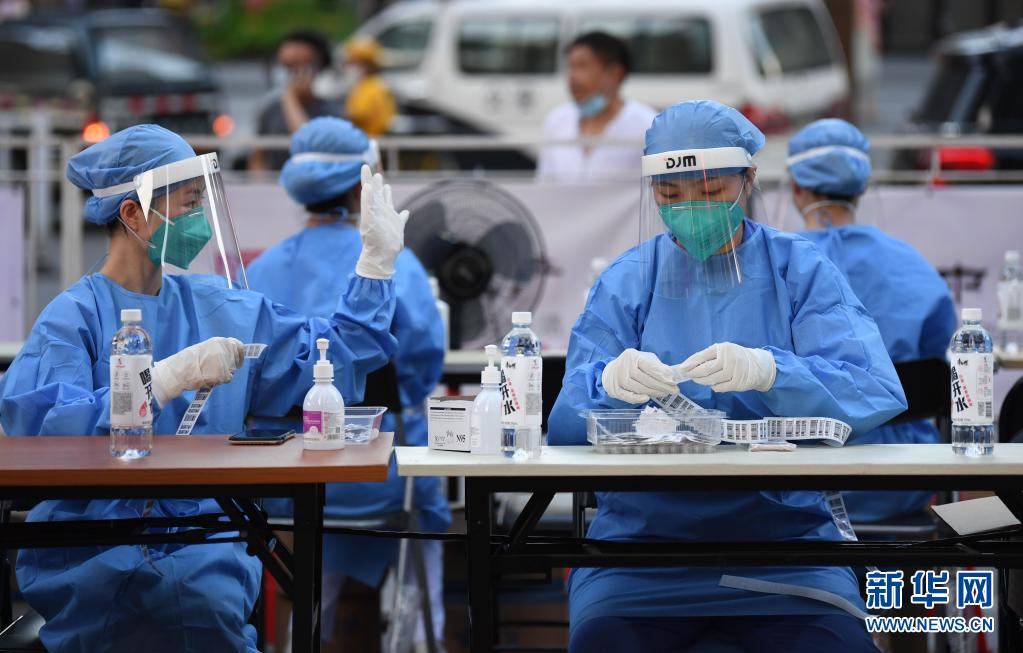 5月27日,在廣州荔灣區(qū)廣鋼新城核酸臨時(shí)采集點(diǎn),南方醫(yī)科大學(xué)南方醫(yī)院的醫(yī)務(wù)人員進(jìn)行檢測(cè)前的準(zhǔn)備工作。新華社記者 鄧華 攝