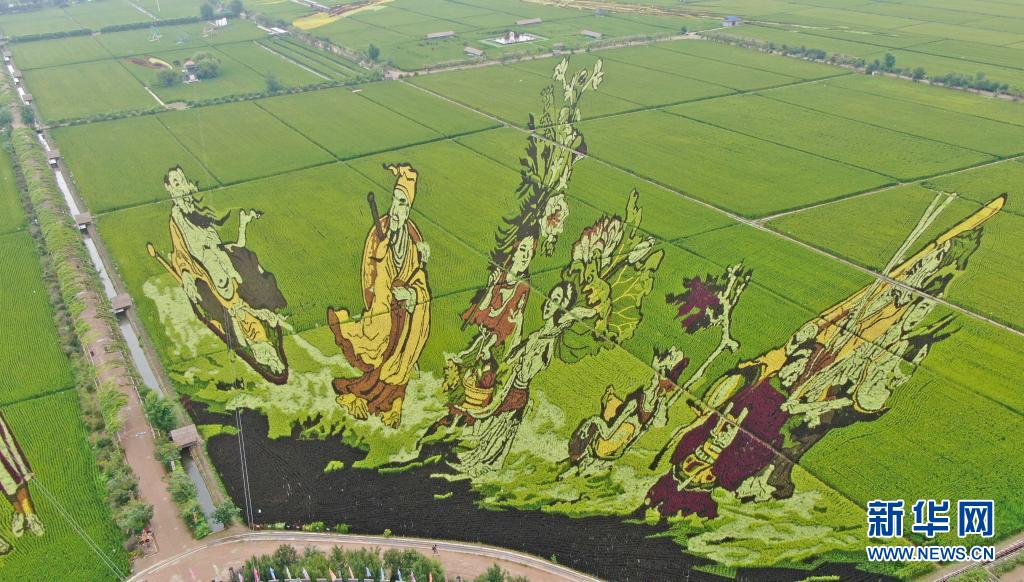 這是8月16日拍攝的稻田畫(huà)《八仙過(guò)海》(無(wú)人機(jī)照片)。
