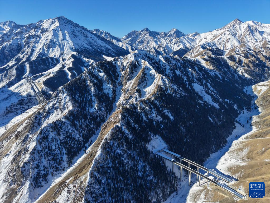 桥隧相连的乌尉高速公路穿越天山山脉(12月23日摄,无人机全景照片)。