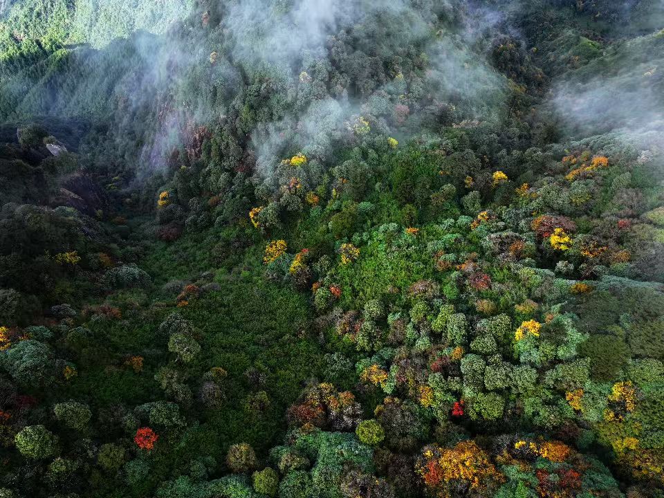 初冬時節(jié),走進云南省騰沖市猴橋鎮(zhèn)輪馬村粉竹壩,層林盡染,五彩斑斕,彩色山林如巨幅油畫鋪展于群山之間。薄霧繚繞中,山林靜謐而幽遠,構成一幅濃墨重彩的冬日畫卷。