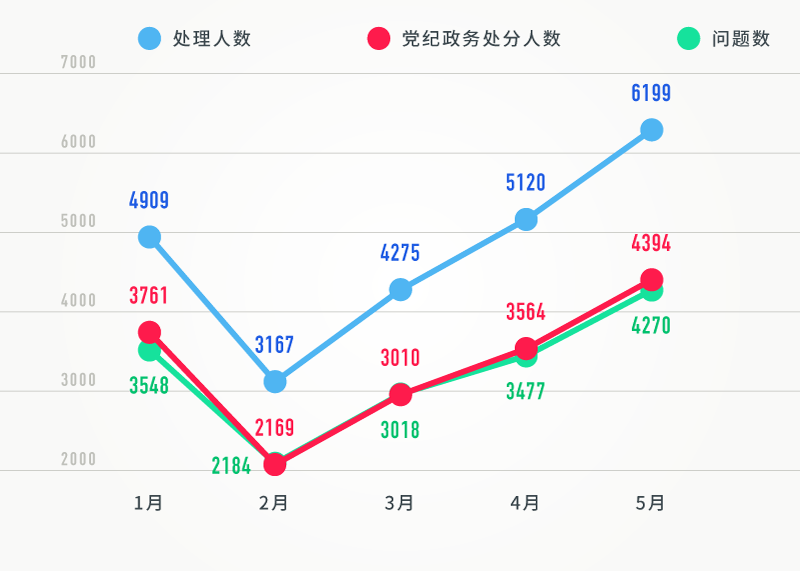 仔細梳理發(fā)現,今年1-5月,每月全國查處違反中央八項規(guī)定精神問題數、處理人數、給予黨紀政務處分人數相比去年同期均大幅上升。此外,除2月有下降外,1-5月的各項數據呈逐月攀升趨勢。