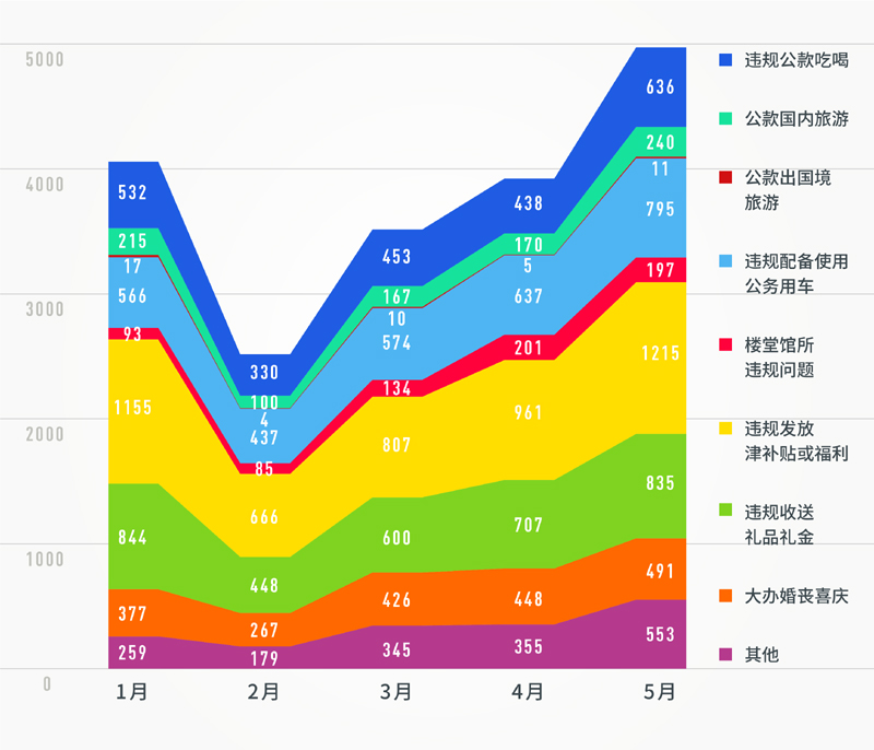 再來看,違反中央八項規(guī)定精神問題類型。從1至5月各類查處問題的面積分布圖來看,各類具體問題的查處趨勢也保持了較穩(wěn)定的增長態(tài)勢。值得注意的是,違規(guī)發(fā)放津補貼或福利、違規(guī)收送禮品禮金、違規(guī)配備使用公務用車、違規(guī)公款吃喝、大辦婚喪喜慶等問題類型,相比同期仍是所有問題類型的“大頭”(占據前5名),占比仍超80%。數據顯示,這些老問題,仍需下大氣力糾治,持之以恒,久久為功。