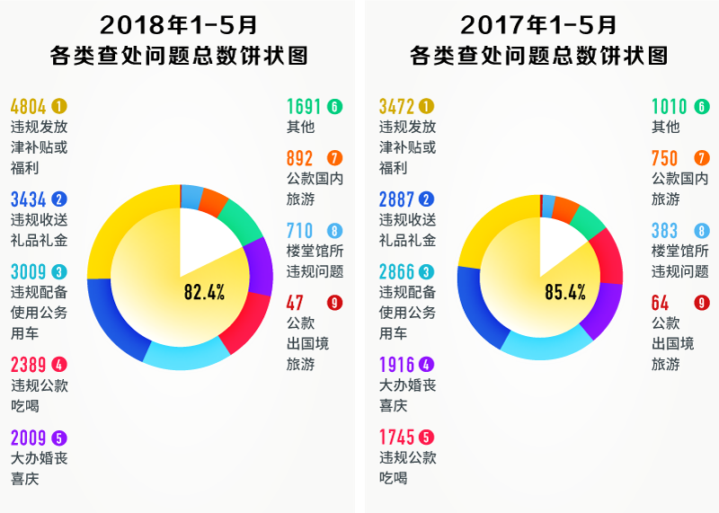 2017年、2018年1-5月各類查處問題總數餅狀圖,違規(guī)發(fā)放津補貼或福利、違規(guī)收送禮品禮金、違規(guī)配備使用公務用車、違規(guī)公款吃喝、大辦婚喪喜慶等“老問題”占比較大,均超80%