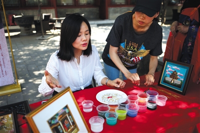 今年6月29日,西城區(qū)非物質(zhì)文化遺產(chǎn)保護中心,非遺傳承志愿者為市民介紹彩砂工藝。當天,西城區(qū)啟動非遺項目傳承志愿者招募活動?;顒庸苍O(shè)5個項目,包括木板年畫、京作核雕等。資料圖片/新京報記者 王嘉寧 實習生 梁思成 攝