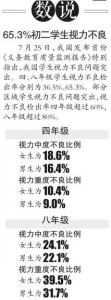 《義務(wù)教育質(zhì)量監(jiān)測報告》指出,學(xué)生視力不良問題突出,四年級、八年級學(xué)生視力不良檢出率分別為36.5%和65.3%。實際上,不僅僅只有報告中義務(wù)教育的學(xué)生存在視力問題,我國青少年視力的整體情況也十分不樂觀。根據(jù)世界衛(wèi)生組織的最新研究報告,目前中國近視患者人數(shù)多達6億。其中我國初高中生和大學(xué)生的近視率均已超過七成。我國青少年近視率已高居世界第一。相比之下,美國青少年的近視率約為25%,澳大利亞僅為1.3%,德國的近視率一直控制在15%以下。