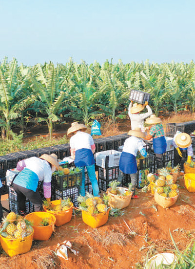 廣東湛江市徐聞縣盛產(chǎn)菠蘿,種植面積達(dá)35萬畝,年產(chǎn)量近50萬噸。春節(jié)臨近,菠蘿開始大量上市。圖為村民在田間將菠蘿打包裝車,準(zhǔn)備銷往全國(guó)各地。羅艾樺 陳北跑攝影報(bào)道