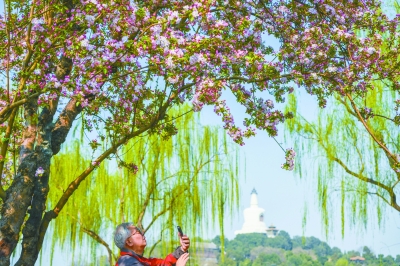 近日,北海公園西岸三十多年樹齡的西府海棠花開正盛,綠肥紅瘦吸引市民前來觀賞。本報(bào)記者 鄧偉攝