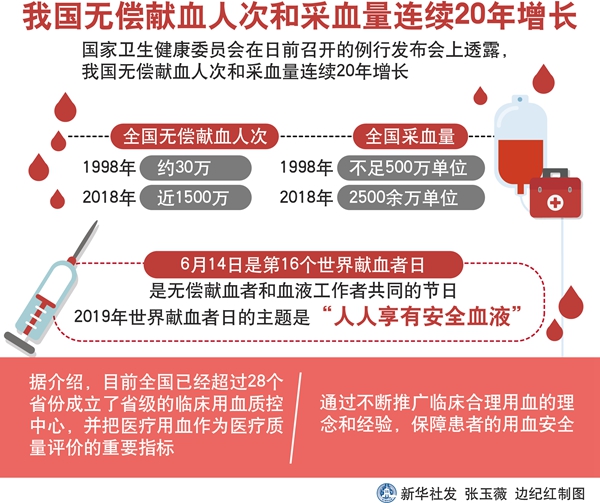新華社北京6月11日電(記者屈婷)國(guó)家衛(wèi)生健康委員會(huì)在日前召開(kāi)的例行發(fā)布會(huì)上透露,我國(guó)無(wú)償獻(xiàn)血人次和采血量連續(xù)20年增長(zhǎng),2018年無(wú)償獻(xiàn)血人次接近1500萬(wàn),采血量達(dá)到了2500萬(wàn)單位。