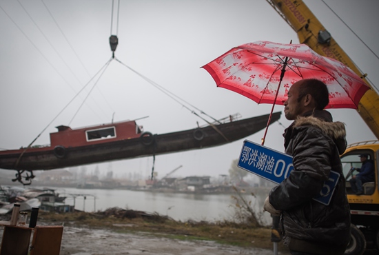 在長(zhǎng)江新螺段白鱀豚國(guó)家級(jí)自然保護(hù)區(qū)漁船拆解現(xiàn)場(chǎng),漁民夏明星注視著被吊起的漁船(2019年12月25日攝)。新華社記者?肖藝九/攝