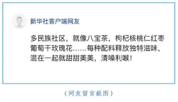 還有網(wǎng)友以寧夏著名的八寶茶來(lái)形容各民族團(tuán)結(jié)和諧的景象——各種配料搭在一起,才能有滋有味。缺哪一樣,都少點(diǎn)“茶味”。