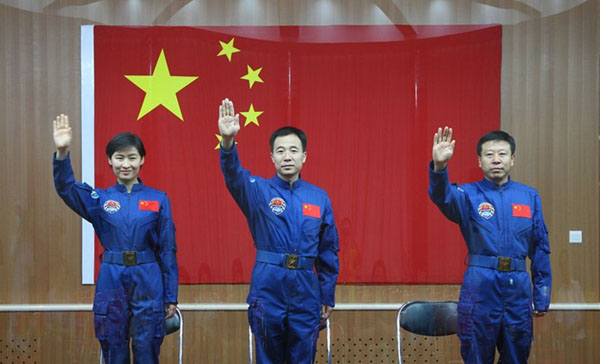 航天員景海鵬、劉旺、劉洋向大家致禮