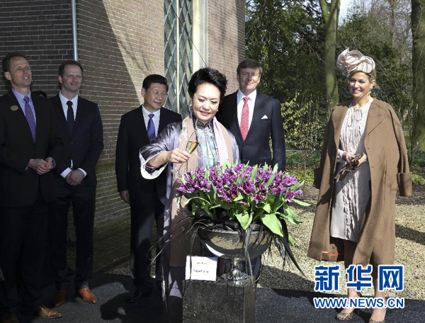 3月23日,中國國家主席習(xí)近平和夫人彭麗媛在荷蘭國王威廉-亞歷山大和馬克西瑪王后陪同下參觀中荷農(nóng)業(yè)合作和荷蘭郁金香花展。彭麗媛應(yīng)邀將新培育的郁金香命名為“國泰”,并按當(dāng)?shù)貍鹘y(tǒng)澆上香檳。資料圖