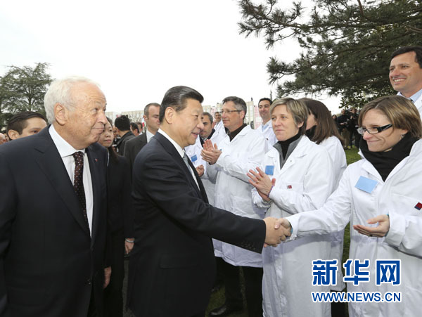 習(xí)近平和夫人彭麗媛抵達(dá)時(shí),梅里埃集團(tuán)總裁阿蘭·梅里埃率家族成員以及該中心員工列隊(duì)熱烈歡迎。法國(guó)政府外長(zhǎng)法比尤斯、高教部長(zhǎng)菲奧拉索陪同參觀。
