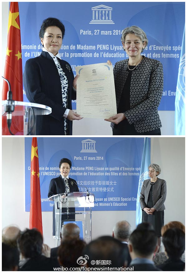 ????新華網(wǎng)北京3月27日電 據(jù)新華社“新國際”微博報道,習近平主席夫人彭麗媛27日在巴黎聯(lián)合國教科文組織總部被授予“促進女童和婦女教育特使”榮譽稱號。從博科娃總干事手中接過證書后,彭麗媛說,這是一項崇高的事業(yè),我愿意盡我所能,幫助更多孩子,為更多姐妹爭取接受教育的權利。