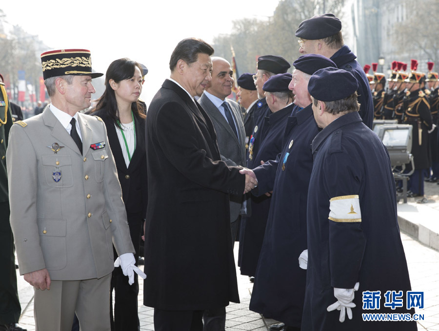 3月27日,國家主席習(xí)近平在巴黎向法國無名烈士墓獻(xiàn)花圈。這是習(xí)近平與老戰(zhàn)士交談。 新華社記者蘭紅光攝