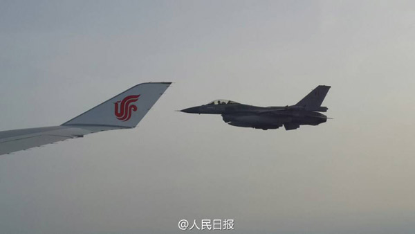 ????當(dāng)習(xí)近平乘坐的專機(jī)進(jìn)入比利時(shí)領(lǐng)空時(shí),比利時(shí)皇家空軍兩架戰(zhàn)機(jī)升空護(hù)航。(圖片來源:《人民日報(bào)》法人微博)
