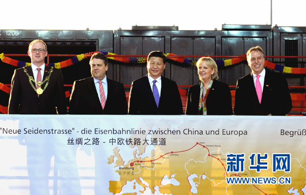 ????習(xí)近平來到火車站臺(tái)。三聲鑼響后,一列從中國(guó)重慶始發(fā)的列車滿載著貨物緩緩駛?cè)?。這里是由重慶經(jīng)新疆跨歐亞直至歐洲的渝新歐國(guó)際鐵路聯(lián)運(yùn)大通道的終點(diǎn)。