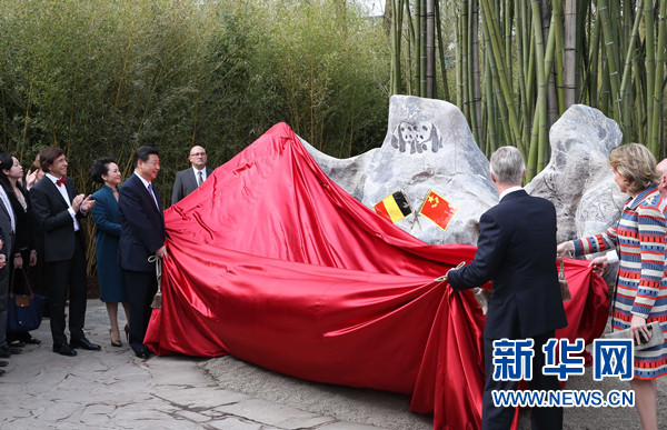 ????3月30日,國家主席習近平和比利時國王菲利普共同出席比利時天堂公園大熊貓園開園儀式。這是習近平和夫人彭麗媛同菲利普國王夫婦共同為大熊貓園揭幕。 新華社記者 龐興雷 攝