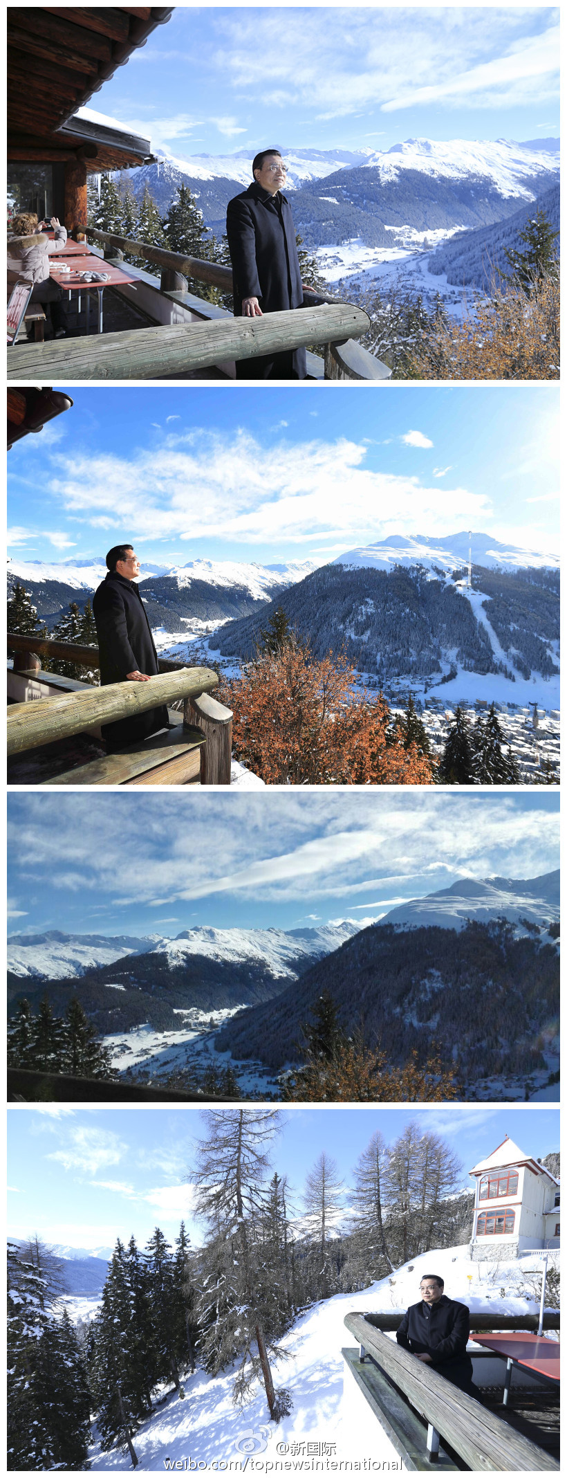 ???? 新華網(wǎng)北京1月21日電 據(jù)新華社“新國際”微博報道,再過一小時,世經(jīng)論壇工商對話會及論壇年會將開幕。此刻李克強總理來到下榻飯店邊海拔1800米的沙茨阿爾卑山頂,極目遠眺,放眼達沃斯。此次大會主題是“全球新局勢:我們如何應對”。作為唯一在大會開幕式上發(fā)表特別致辭的外國領導人,李克強的應對方案備受矚目。