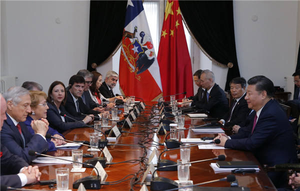 11月22日,國(guó)家主席習(xí)近平在圣地亞哥同智利總統(tǒng)巴切萊特舉行會(huì)談。(新華社記者 鞠鵬 攝)