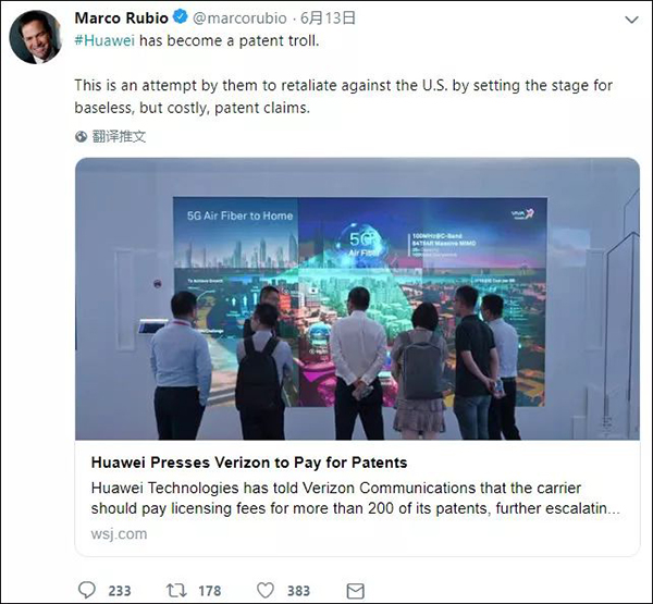 作為美國(guó)反華政客中最激進(jìn)最極端的一個(gè)人,盧比奧多次叫嚷中國(guó)“偷”美國(guó)“知識(shí)產(chǎn)權(quán)”。但是聽到這個(gè)消息后,他立馬撤下了那套“捍衛(wèi)者”的偽裝,給合理維權(quán)的華為扣上“專利流氓”的帽子,還宣稱華為的專利都是“沒(méi)有依據(jù)”的。